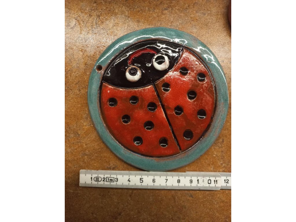 Beruška placka cca 10 cm v průměru..7 mm vysoká placka.dírka na pověšení nebo na mašličku.
