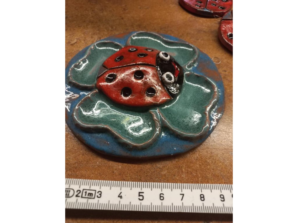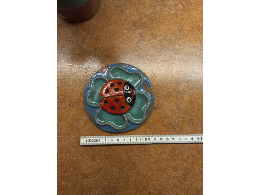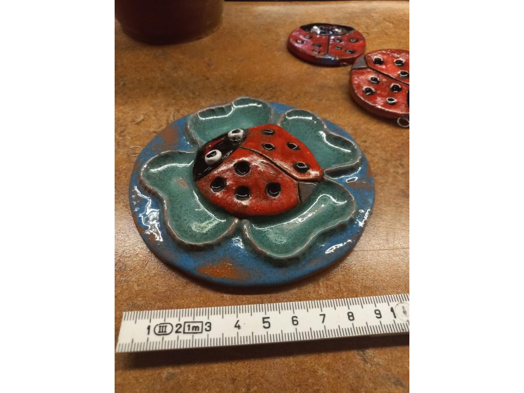 Beruška.. placka cca 10 cm průměr.7mm vysoká. Můžeme pověsit na stěnu, za kovový úchyt. Můžeme nechat celoročně venku.