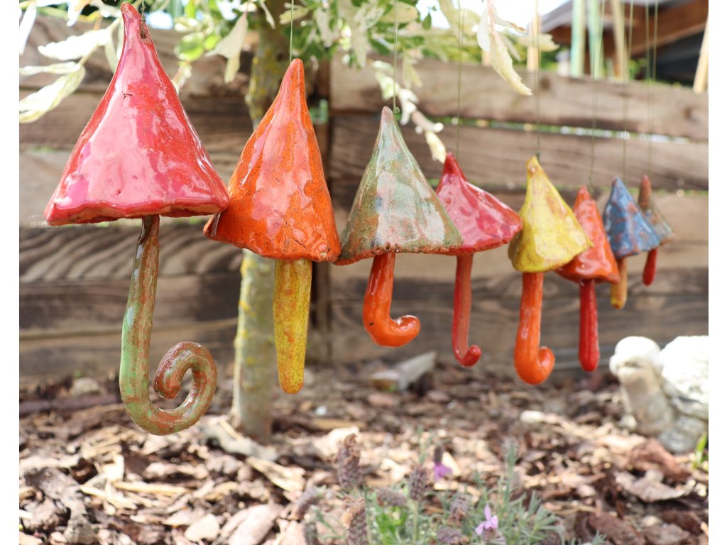 Tato zvonkohra je plna barev, radosti a energie. Houbičky jsou ručně vyráběné a malované, každá je originální. Je ideální pro ty, kteří milují přírodu a chrám klidu na své zahradě či balkoně. Udělejte radost sobě nebo svým blízkým originálním keramickým výrobkem.